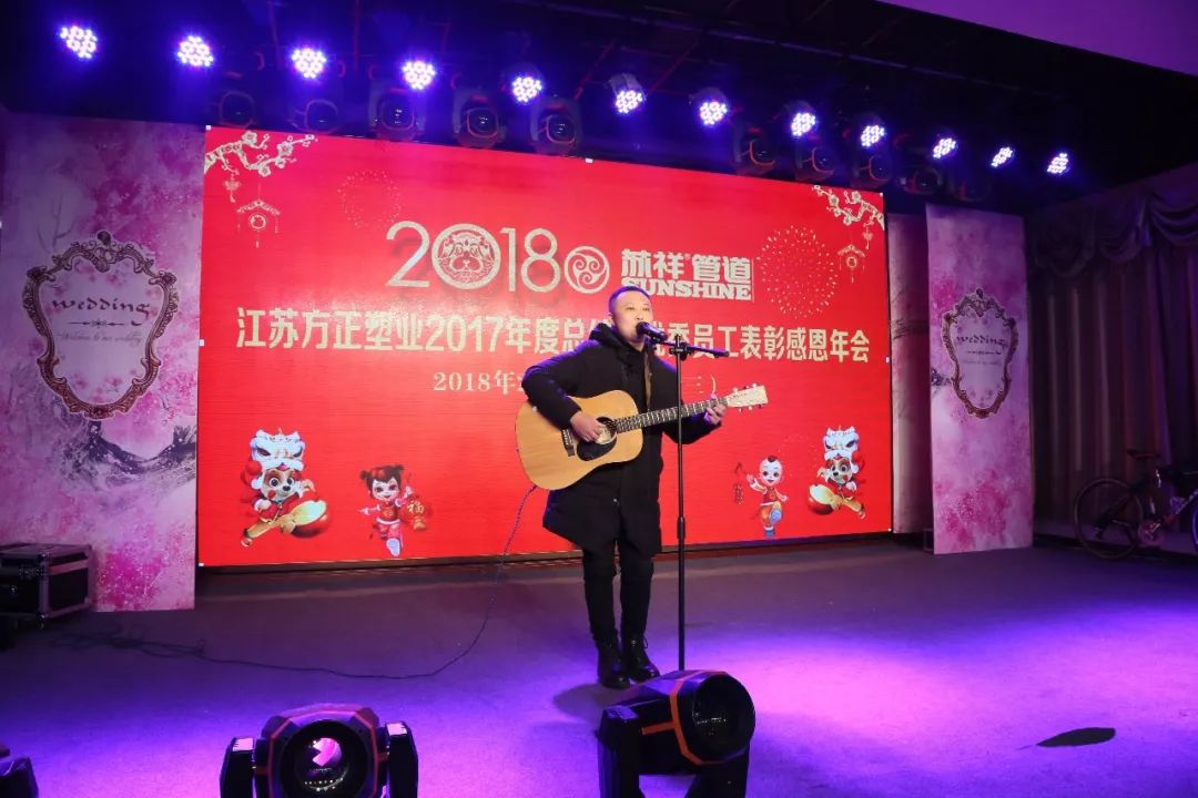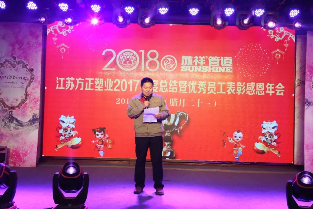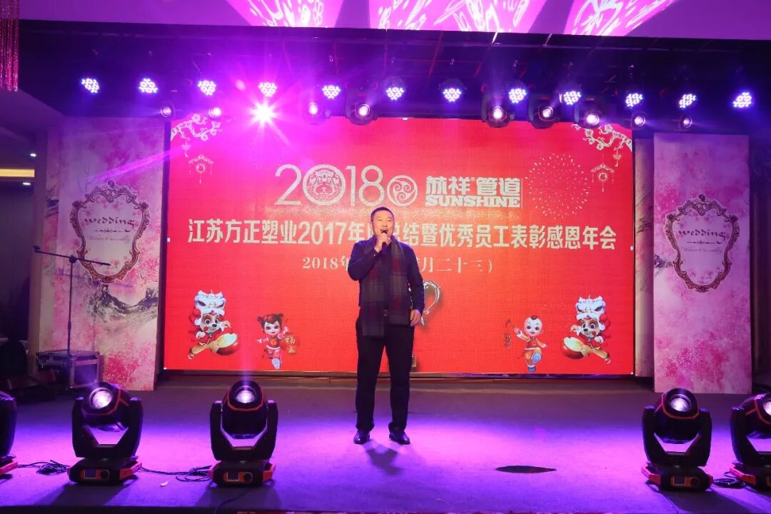 送别金鸡,喜逢瑞犬,岁岁今朝言笑欢。2018年2月8日(腊月二十三)晚上18时:50分,江苏方正塑业2017年度工作总结暨优秀员工表彰感恩年会正式开始。 下午时间:18:00,尊贵的嘉宾陆续签到入场,并一一合影留念,见证这激动人心的时刻。 18:50分感恩年会正式开始,首先是开场舞蹈:美丽漂亮的女孩们给大家带来喜庆的舞蹈,红红火火,看着她们的表演甚好,台下嘉宾连连叫好鼓掌。 随后江苏方正塑业有限公司总经理张正汉同志作了2017年度的工作总结报告,他说到,首先感谢社会各界对方正塑业的支持,没有你们的支持就没有方正塑业快速发展的今天,同时也感谢方正塑业各部门同事互相团结配合,使公司不断完善稳步发展,另外方正塑业也为主要客户提供了服务,比如:南京长江大桥的建设、中铁,南京地铁等项目。最后他祝大家再2018年工作顺利,阖家欢乐、家庭幸福。 随后江苏方正塑业有限公司董事长张正刚,邀请嘉宾及公司全体员工共同举杯   并宣布感恩年会晚宴正式开始 2017年公司的业绩不断增长,这离不开优秀团队成员,是他们的努力,公司才取得了优异的成绩,在这里我们祝他们在新的一年里再接再厉,同时也希望没有获得优秀员工的同事2018年再接再厉。 随后由民间歌手小鱼儿带来了精彩的表演,现场气氛一致火爆失控  ,大家都笑的合不拢嘴,台下的嘉宾们也互相你敬我酒,我敬你酒,泗洪话叫,您尅酒哎。  随后张总的千金张译文小美女给大家带来了经典的古筝弹奏,那叫一个好,张译文小美女不仅在校学习成绩优异,琴谈的好,而且还是一位懂事听话的小女生。 【幕后工作者花絮】 联系我们 江苏方正塑业有限公司 地址:江苏省泗洪县经济开发区昆仑山路10号 电话:400-960-1058 传真:0527-89884768 邮编:223900